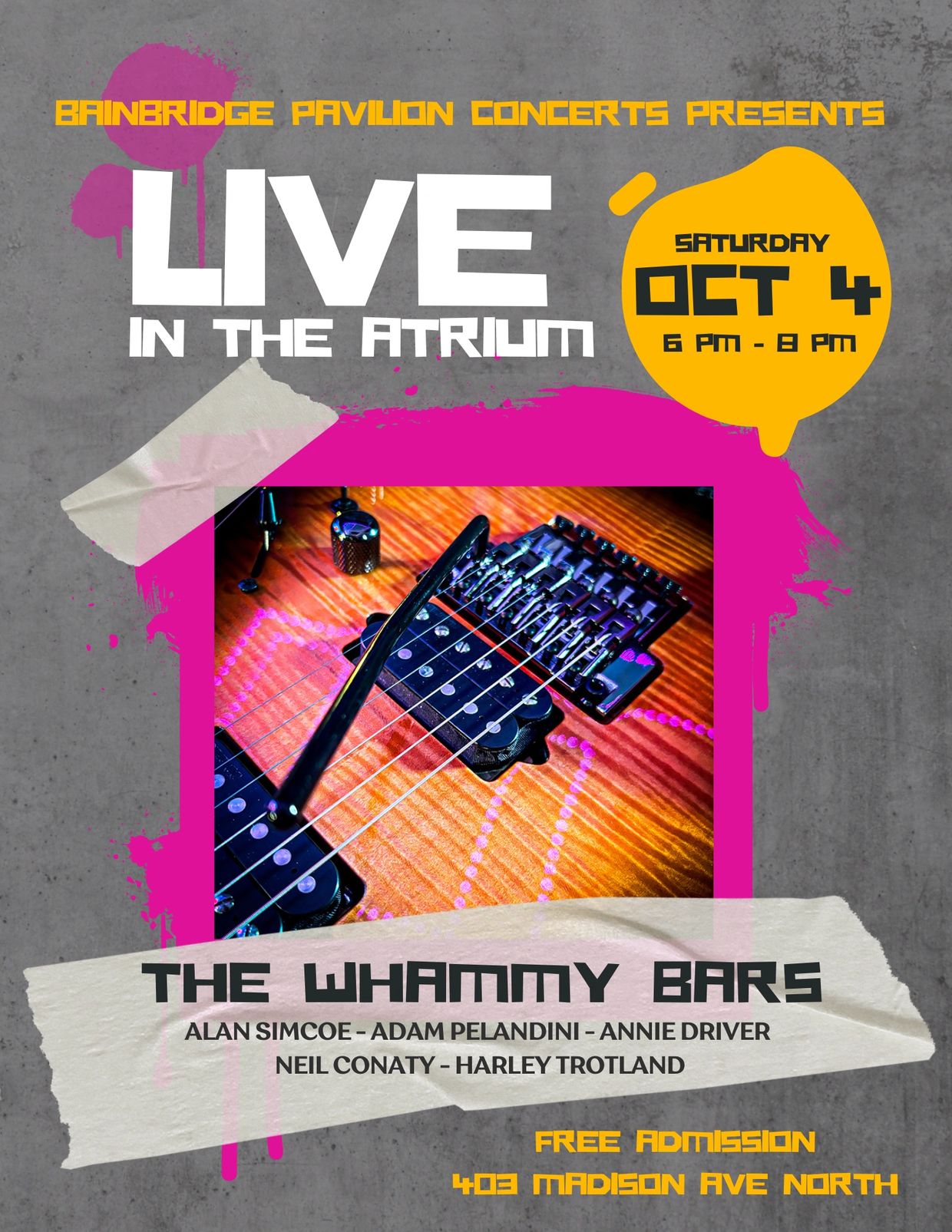 Get ready for jazzy blues and breezy Caribbean grooves with The Whammy Bars! This all-star Bainbridge ensemble—featuring Alan Simcoe, Adam Pelandini, Annie Driver, Neil Conaty, and Harley Trotland—melds silky horn solos, syncopated rhythms, and soulful vocals into a genre-bending soundscape that’s perfect for fall.